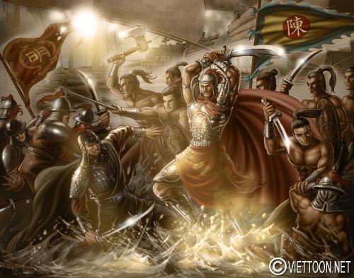 Đặng Tất – Tướng tài đời hậu Trần (cha của Đặng Dung) Ông đã lãnh đạo quân đội nhà hậu Trần đánh tan quân Minh tại trận Cô Bô – 1 chiến tích oanh liệt của ông. Tranh vẽ lại cảnh Đặng Tất tại Cô Bô. Y giáp dựa vào y giáp nhà Trần.