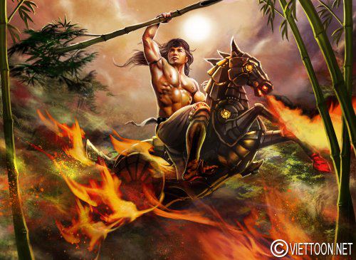 Bấy giờ có giặc Ân đến xâm phạm bờ cõi nước ta. Thế giặc mạnh, nhà vua lo sợ. Bèn truyền cho sứ giả đi khắp nơi tìm người tài giỏi cứu nước. Ðứa bé nghe tin, bỗng dưng cất tiếng nói: "Mẹ ra mời sứ giả vào đây". Sứ giả vào, đứa bé bảo: "Ông về tâu vua sắm cho ta một con ngựa sắt biết phun lửa, một cái roi sắt và một tấm áo giáp sắt, ta sẽ phá tan lũ giặc này".