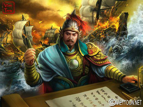 Hưng Đạo Vương Trần Quốc Tuấn đang viết bài hịch lưu truyền muôn đời: Hịch Tướng Sĩ. Phía sau là bối cảnh trận đánh oanh liệt tại sông Bạch Đằng. Y giáp phỏng theo tượng ông tại Sài gòn và tranh vẽ trên tiền của Việt Nam Cộng Hòa.