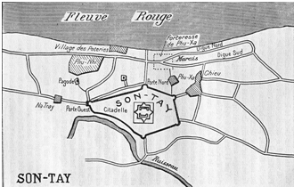...Thành trì Sơn Tây nằm giữa trung tâm thành phố, cách Sông Hồng khoảng 2 cây số. Thành có kiểu hình vuông, mỗi cạnh dài 500m. Một bức tường bao quanh, xây gạch cao 5m. Một cái hào đầy nước rộng khoảng 20m bao quanh thành lũy, hết hào nước là một con đường để đi tuần tra, ngăn cách giữa hào nước với tường thành. Những người An Nam gọi đường đó là đường voi (tượng đạo, đường để voi đi). Ở giữa bề mặt của mỗi bức tường thành có một nửa tháp hình bán nguyệt đường kính 30m, bố trí nhiều lỗ châu mai. Cửa ra vào thành trì được đặt bên sườn tháp bán nguyệt tại điểm tiếp giáp với tường thành. Cây cầu bằng gạch bắc qua hào nước, không được bố trí ngay trước cửa ra vào mà được xây dựng vào khoảng giữa tháp. Đó là kiểu bố trí thông minh về phương diện phòng thủ: sau khi những kẻ tấn công qua được cầu, mà lối lên cầu có một cửa làm bằng những thanh gỗ lớn chắn ngang, bắt buộc họ phải men theo bức tường bán nguyệt của tháp bằng đường voi đi (tượng đạo) trước khi đến được cửa thành. Họ có thể bị những người đứng trên tường thành giết chết ở cự ly gần mà hầu như không thể chống trả được.