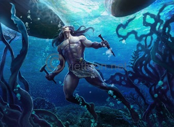 Tương truyền, ông nhà nghèo, hằng ngày ông phải đi mò cua bắt ốc, bắt cá đem bán lấy tiền đong gạo nuôi thân. Ông có sức khỏe và dũng cảm lạ thường. Một hôm thấy hai con trâu trắng đang húc nhau trên bãi cát, ông dùng đòn gánh phang, cả hai con trâu chạy biến xuống nước. Ông mới biết hai con trâu mình vừa đánh là trâu thần, sờ lại đầu đòn gánh thì thấy còn dính vài cọng lông, ông liền nuốt lấy, từ đó mà ông bơi lặn giỏi. Ông lội nước hàng mấy dặm như đi trên đất và thường lặn lội bắt cá, mò trai cả ngày dưới nước.